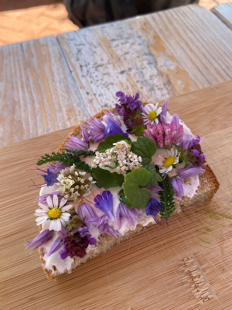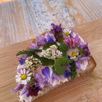 Zurück auf dem Anwesen von Daniela Riesinger wurden noch zwei wilde Kräuter Rezepte von den Teilnehmern ausprobiert, nämlich eine Elfenspeise aus Quark auf Brot und ein Wiesenkraft-Saft auf Apfelsaftbasis mit Kräutern und Springkrautblüten. Zum Abschluss verköstigten alle zusammen noch die Kräuterlimonade und die Kinder dekorierten die Brote mit gesammelten Blüten und Kräutern.
